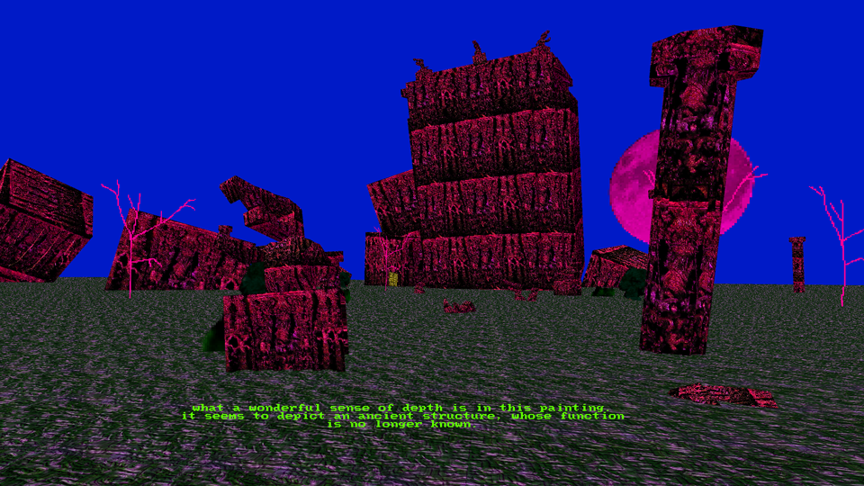 The basic flow of the game is typical of a flatgame: you wander through a mostly-frictionless and unhierarchical (hence 'flat') space, in no particular narrative order, browsing it and conversing with it and gradually building up an understanding of the aesthetic and conceptual position that the game occupies. Nominally, you're searching for the ten postcards that the author has posted to himself, but these mainly seem to serve as milestones, structuring your exploration of the game's world.